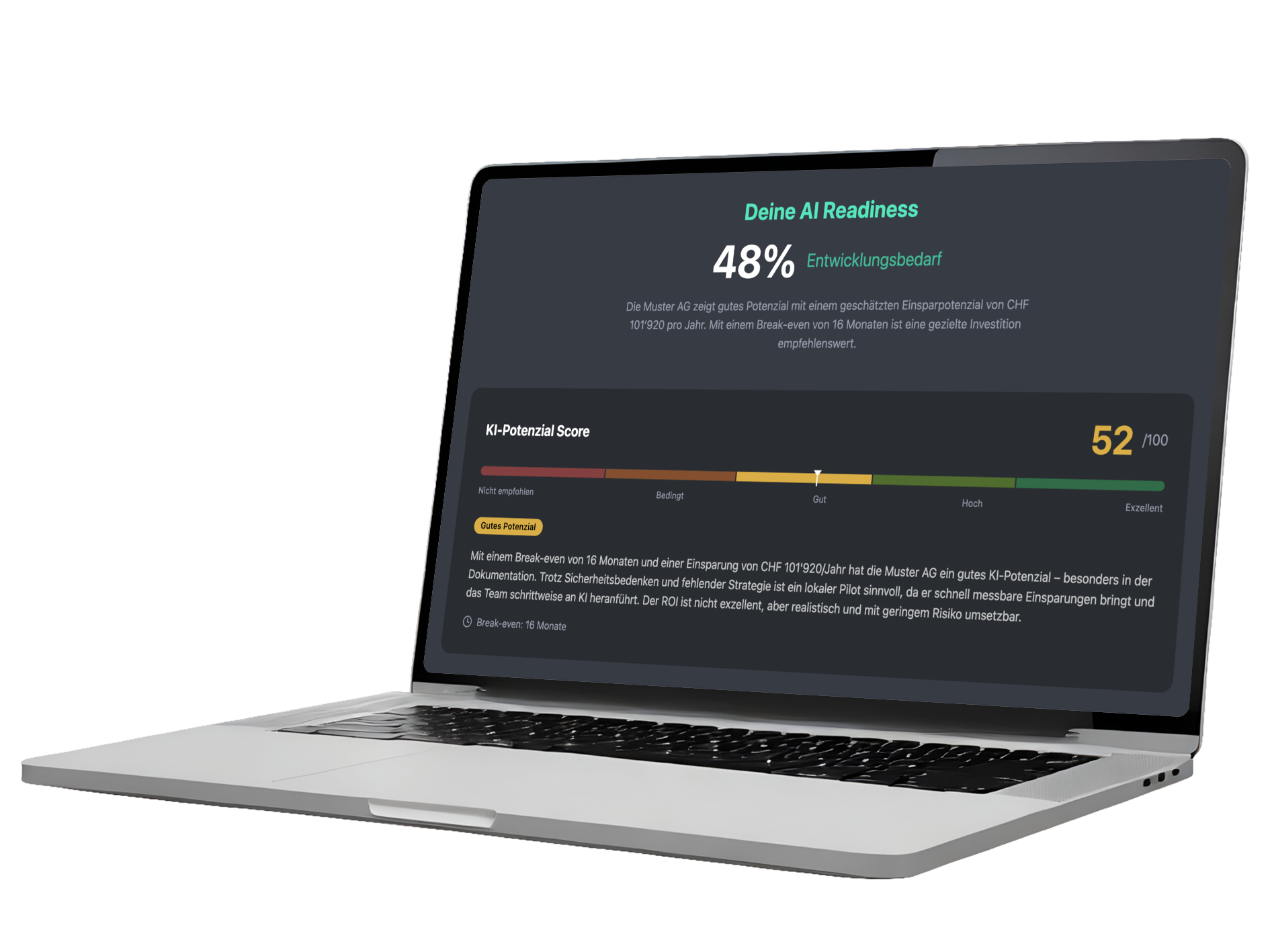 Führe diesen kurzen Test durch und finde innerhalb weniger Minuten heraus, wie ready dein Unternehmen für KI ist, wo die stärksten Hebel sind und wie du vorgehen kannst.